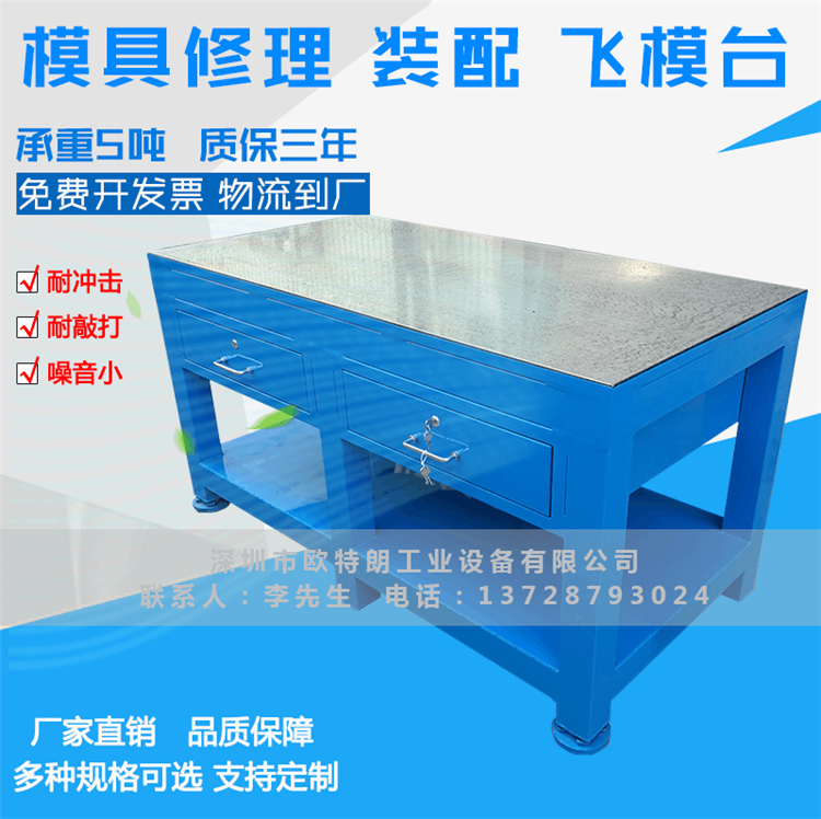 模具裝配工作臺桌面主要由A3或45#鋼板制作,經大水磨處理,桌面平整光滑美觀!桌面鋼板厚度主要有10mm、15mm、20mm、30mm可選,按客戶的承重要求來選擇!