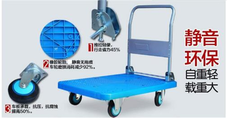 1、 靜音手推車車板為特種樹脂材料或冷軋鋼板,結(jié)實(shí)耐用。