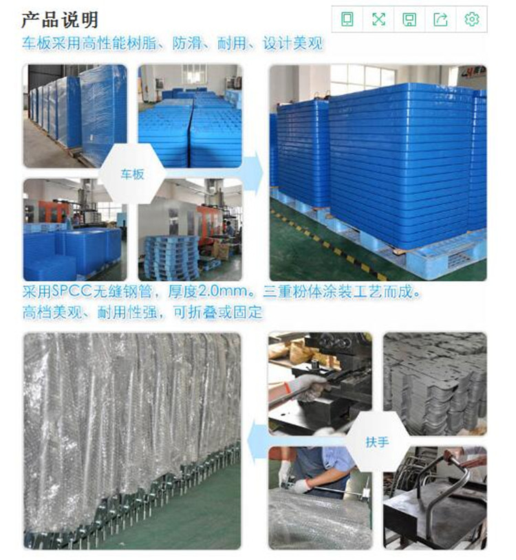 2、塑料車板附加防滑橡膠頭,鋼板車板上表面貼防滑橡膠墊。