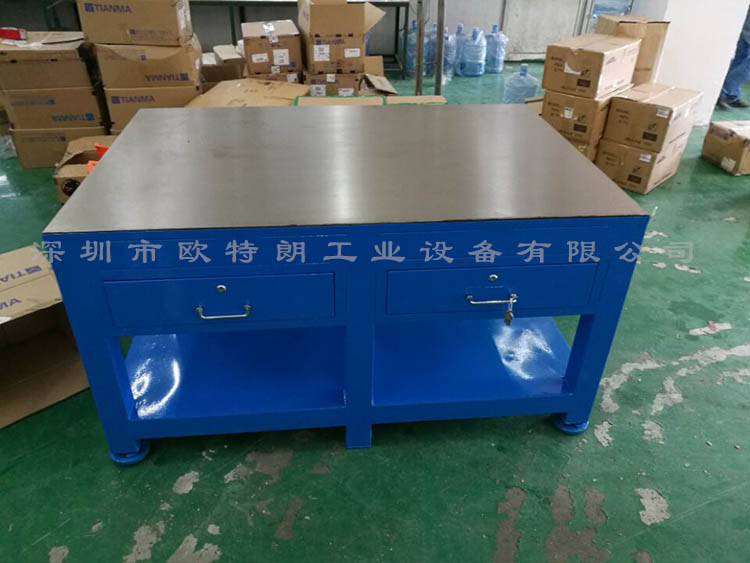 模具工作臺桌面主要由A3或45#鋼板制作,經大水磨處理,桌面平整光滑美觀!桌面鋼板厚度主要有10mm、15mm、20mm、30mm可選,按客戶的承重要求來選擇!