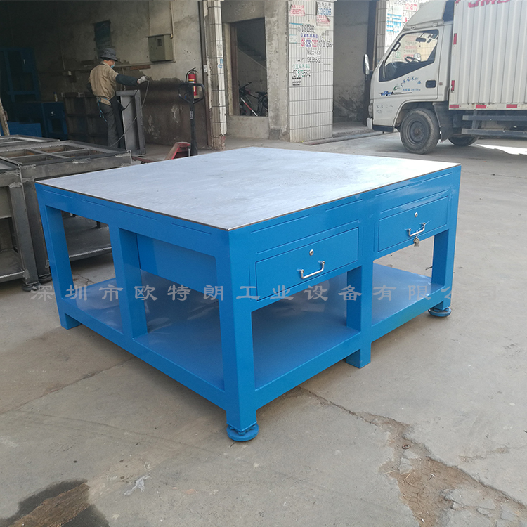 修模工作臺桌面主要由A3或45#鋼板制作,經大水磨處理,桌面平整光滑美觀!桌面鋼板厚度主要有10mm、15mm、20mm、30mm可選,按客戶的承重要求來選擇!