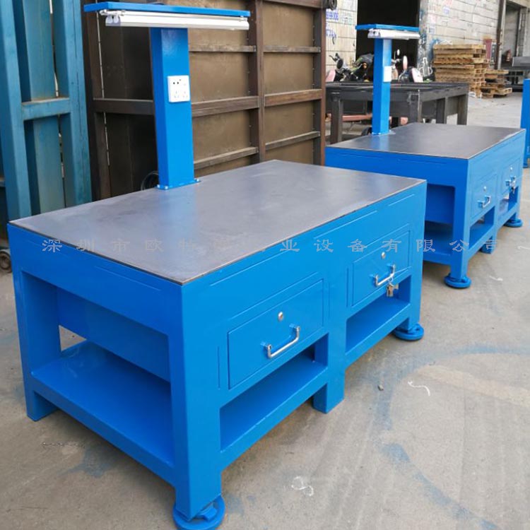 鋼板工作臺桌面主要由A3或45#鋼板制作,經大水磨處理,桌面平整光滑美觀!桌面鋼板厚度主要有10mm、15mm、20mm、30mm可選,按客戶的承重要求來選擇!